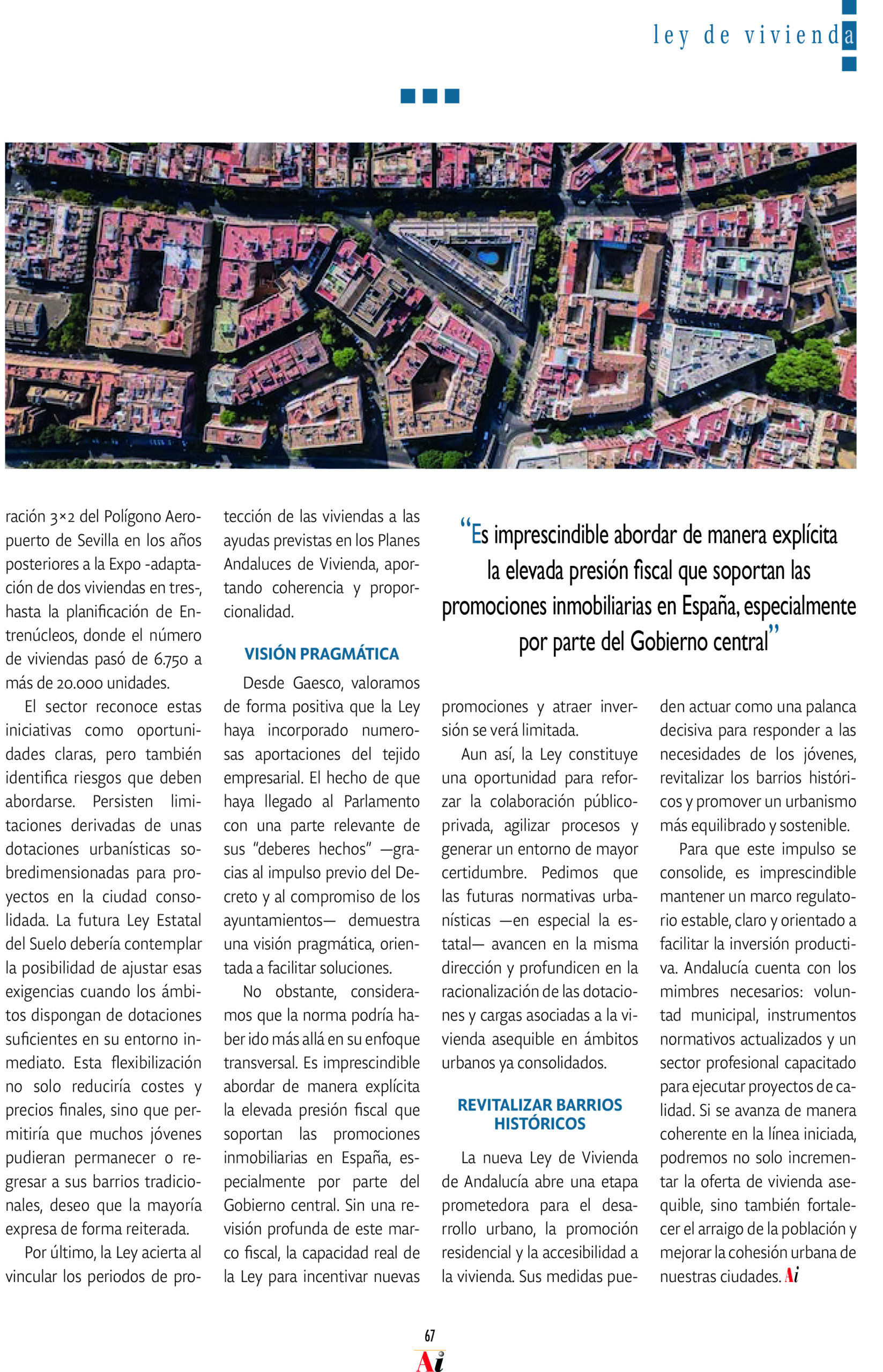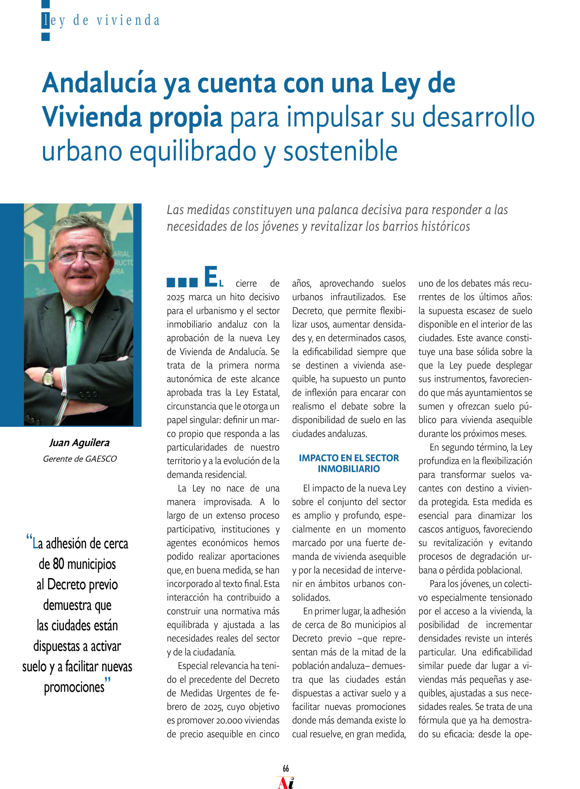 La revista especializada Andalucía Inmobiliaria en su número de enero de 2026 publica un artículo del Gerente de GAESCO, Juan Aguilera, en el que reflexiona sobre la recién aprobada Ley de Vivienda Andaluza. En el mismo destaca que las medidas puestas en marcha constituyen una palanca decisiva para responder a las necesidades de los jóvenes y revitalizar los barrios históricos.