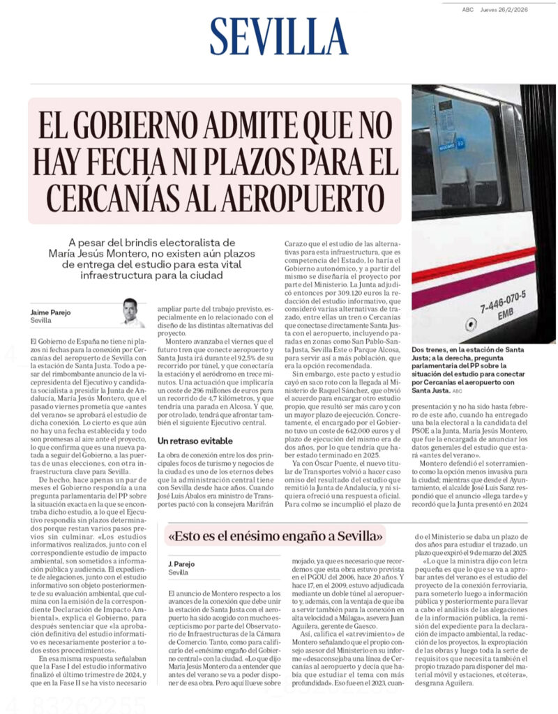 El gerente de GAESCO y portavoz del Observatorio de Infraestructuras de la Cámara de Comercio, Juan Aguilera, en declaraciones al diario ABC de Sevilla ha mostrado su escepticismo respecto al anuncio de la Vicepresidenta del Gobierno central, María Jesús Montero respecto a los avances de la conexión que debe unir la estación de Santa Justa con el aeropuerto.