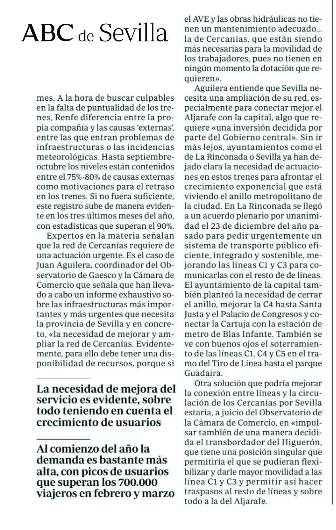 El gerente de Gaesco, Juan Aguilera, en declaraciones a ABC de Sevilla ha reclamado un aumento de los recursos económicos para mejorar y ampliar la red de Cernanías de Sevilla.