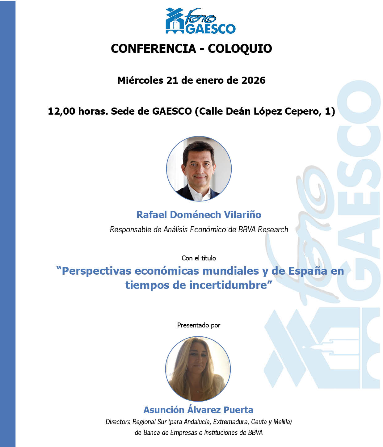 El Miércoles 21 enero de 2026, intervendrá en el FORO GAESCO, Rafael Doménech Vilariño, Responsable de Análisis Económico de BBVA Research, impartiendo una conferencia con el título “Perspectivas económicas mundiales y de España en tiempos de incertidumbre”. Será presentado por Directora Regional Sur (para Andalucía, Extremadura, Ceuta y Melilla) de Banca de Empresas e Instituciones de BBVA, Asunción Álvarez Puerta.